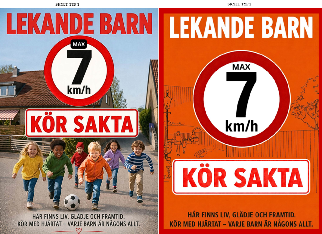 3. Vi har tagit fram nya ”Varning för lekande barn” skyltar som kommer att sättas upp på väl valda lyktstolpar i området. Idag finns det sporadiska skyltar. Vi hoppas att detta fungerar som en tydlig påminnelse om att köra otroligt försiktigt och att man är uppmärksam. Skyltarna är i skrivande stund inte klara men kommer att sättas upp under vår/sommar. Eventuellt tas dessa ner efter säsong för att förlänga livslängden på dem.